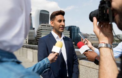 • Black Male Politician and Associate Shaking Hands in front of Flashing Cameras